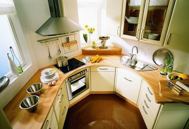 Более оригинальным, на наш взгляд, является полуостровной тип расстановки элементов «рабочего треугольника». В этом случае, кухонный стол одним концом касается стены помещения, размещаясь при этом в центре комнаты. Все же остальные кухонные предметы находятся вокруг этого кухонного стола.
