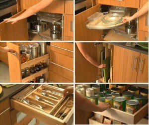 Неотъемлемый атрибут современной функциональной кухни на заказ — это наличие очень удобных кухонных шкафов, внутри которых может оказаться множество удобных приспособлений. Это могут быть уходящие внутрь углового шкафа полки или узкие выдвижные пеналы. Также там могут оказаться секции для хранения разделочных досок.